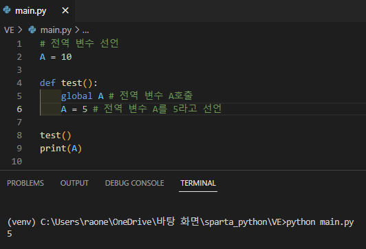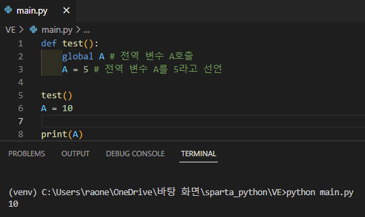 함수 안에서 global A를 써서 전역 변수를 호출하면 함수 안에서 전역 변수 A를 사용할 수 있다.