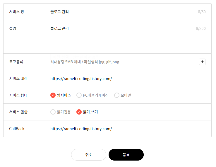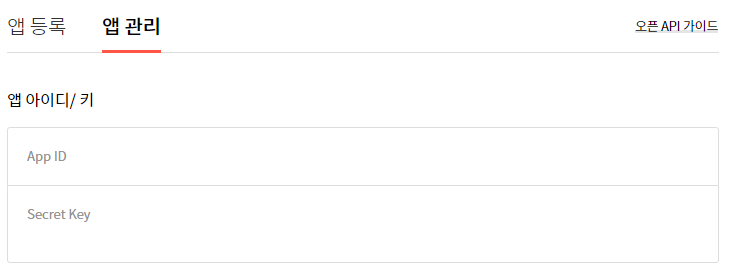 앱 관리 탭에 보면 앱 아이디와 키가 발급되 있을거임
