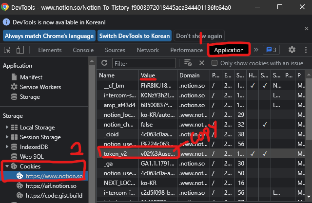 - TOKEN_V2 : http://notion.so 에 들어가서 오른쪽 클릭 > 검사 > Application > Cookies > notion.so