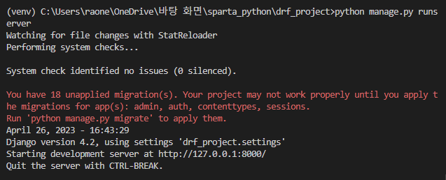 DB파일인 db.sqlite3가 생성됨과 동시에 서버가 작동한다
