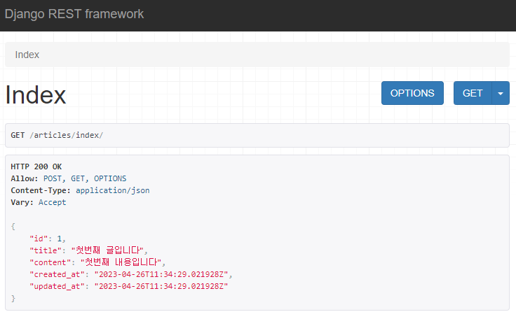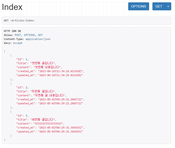 만약 불러올 데이터가 여러개면 serializer에 many=True 옵션을 추가한다