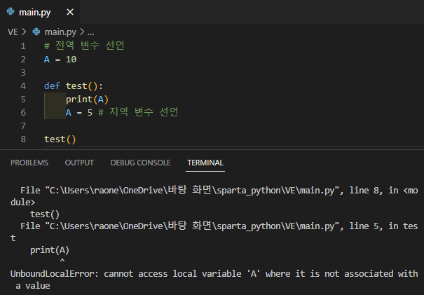 지역 변수 A가 선언되기 전에 print(A)를 해서 에러가 떴다.