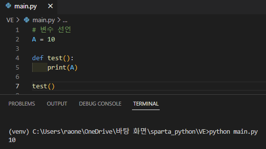 함수 안에서 A를 정의하진 않았지만 함수 test를 불러오면 print(A)가 정상 실행된다