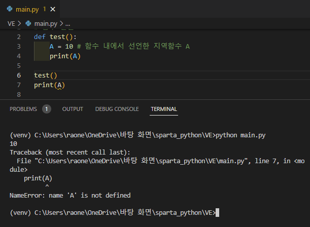함수 안에서 A = 10을 선언해주고 밖에서 print(A)를 해보니