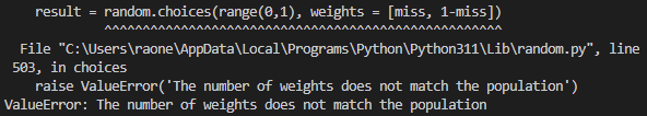 result = random.choices(range(0,1), weights = [miss, 1-miss])